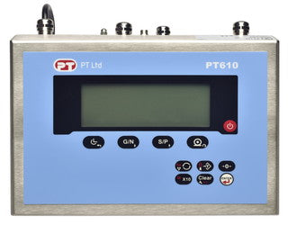 | The PT610 is one of the series PT610, PT620, PT630 advanced indicator series, built robust for industrial, agricultural and hygienic area operation. The PT610 is an advanced, high quality general purpose weighing indicator for industry in a durable IP67 stainless steel housing. Ideal for platform, truck and hopper scales among other applications and is available with a wide range of options. The PT610 is approved by Weights & Measures Authorities for use in Accuracy Class III applications with 10000 intervals in accordance with OIML R76. Weighing, and Dynamic weighing for animals and fluctuating loads are standard as is printing which is selectable from 4 languages. A wide range of options is available for integration by Fieldbus connectivity, desk, wall or panel mounting and digital I/O. Easy and practical operation via navigation keys with 6 large 22mm digits, 16 alphanumeric characters 8mm high and wide viewing angle, multi-colour backlit LCD display. The PT610 is powered by AC power with integral mains cable. A version is available for powering from 12-28VDC. |